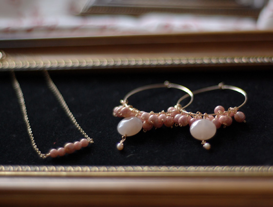 ふんわりと優しいピンクのビーズをふんだんに使った、スイートながらゴージャスな雰囲気のピアス。